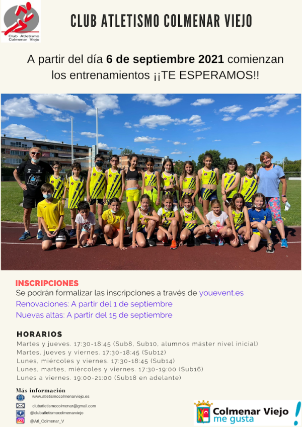Después de una junta con el Ayuntamiento de Colmenar Viejo, acordamos en reestructurar el ingreso escalonado de los grupos para estar acordes al resto de las escuelas deportivas: A partir del 7 de septiembre SÓLO se incorporarán los grupos Sub 16 en adelante: –Sub 16 (Cadete) –Sub 18 ( Juvenil) –Sub 20 –Sub 23…